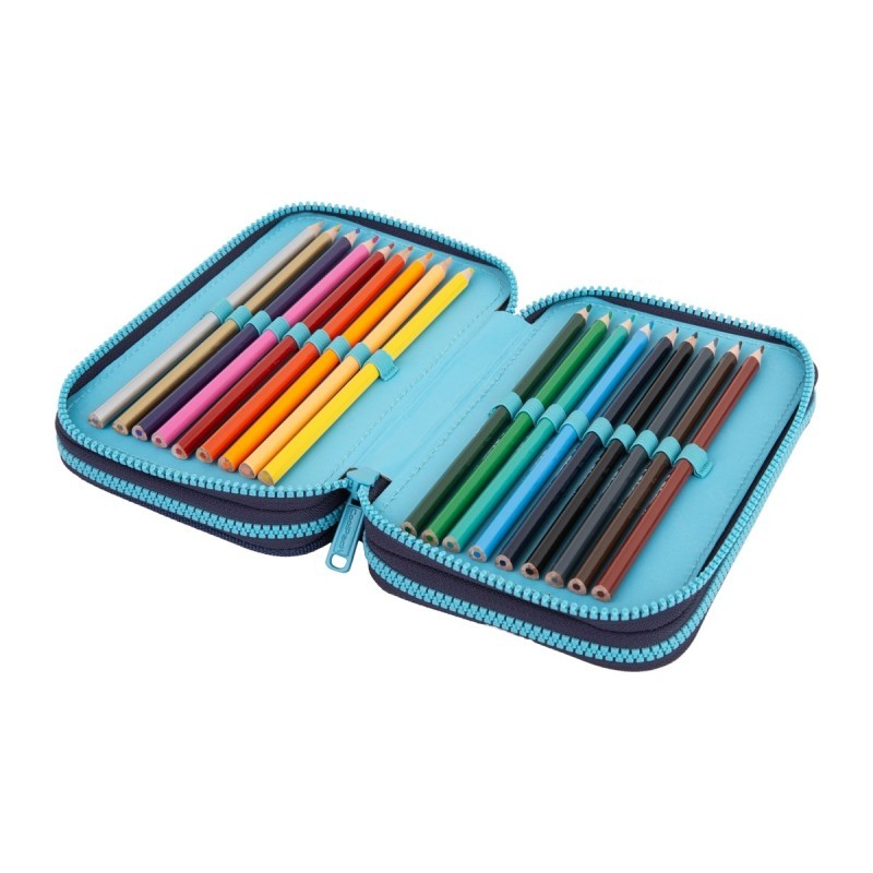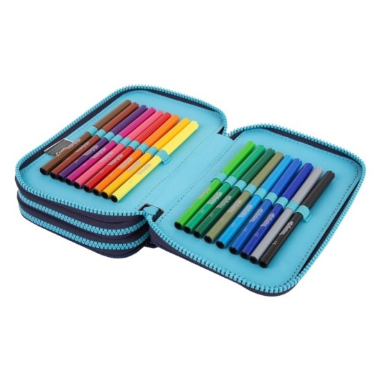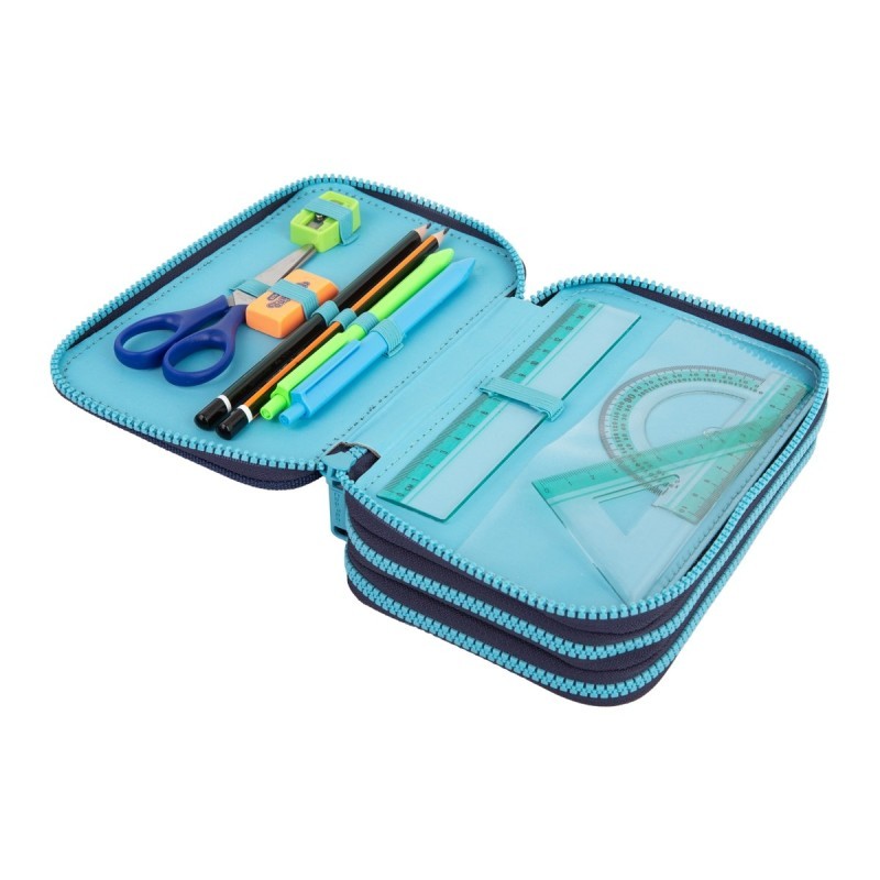 Obsahuje 18 fixek, 18 pastelek, 3 pera, tužku, pravítko, ořezávátko a gumu, úhloměr, trojúhelník, nůžky