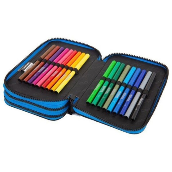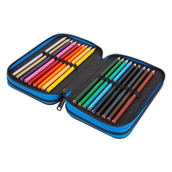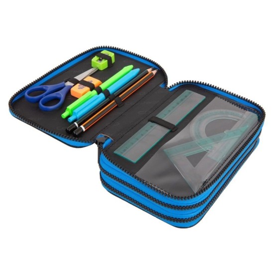 Obsahuje 18 fixek, 18 pastelek, 3 pera, tužku, pravítko, ořezávátko a gumu, úhloměr, trojúhelník, nůžky