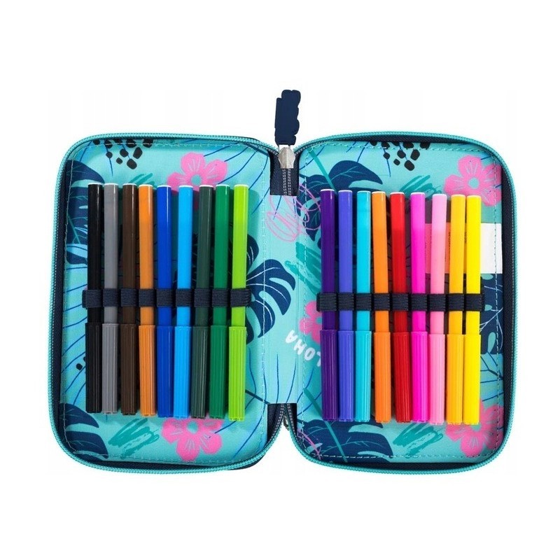 Přihrádky penálu mají gumové úchyty na školní potřeby. Zapínání na zip.