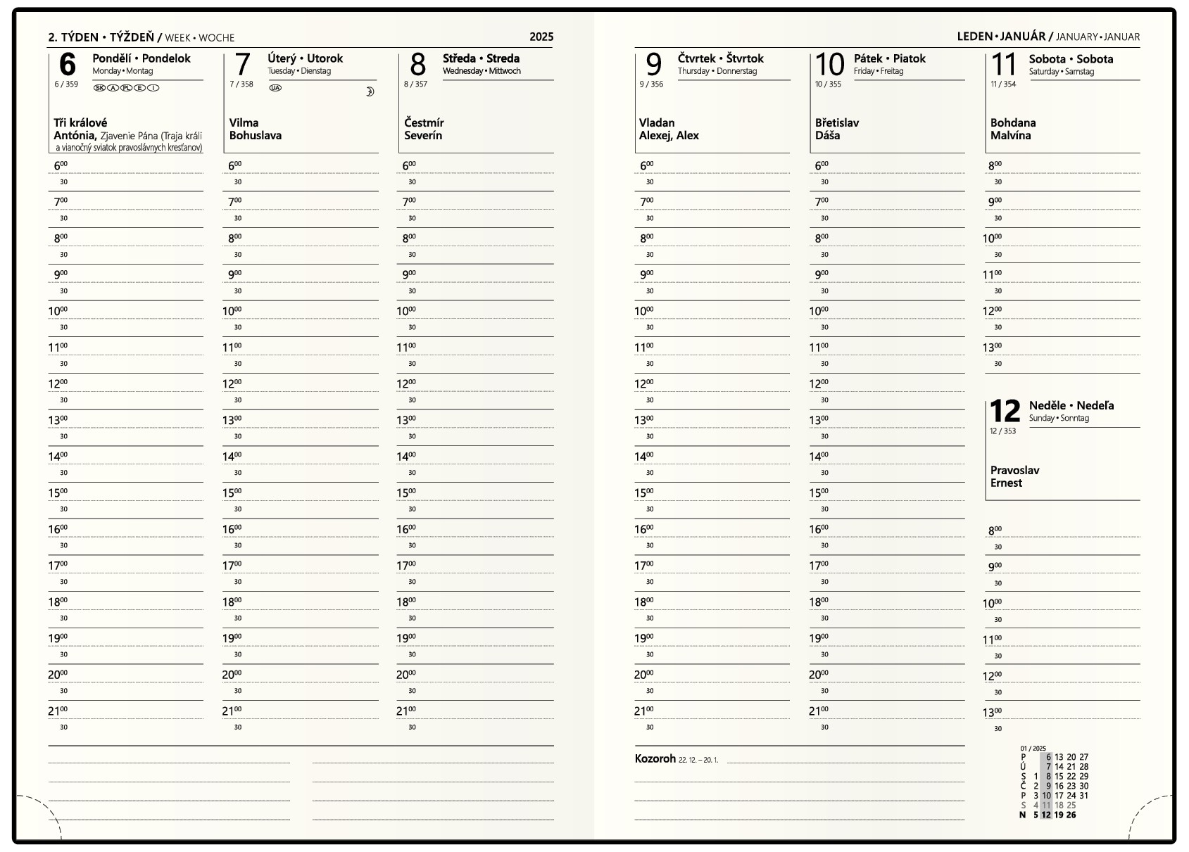 Luxusní týdenní diář formátu A5, který má znovupoužitelný obal. Obal má mnoho přihrádek na vizitky, poutko na tužku a vše je uzavřeno magnetem. Univerzální ražba je velmi stylová.