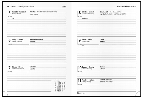 Týdenní diář formátu B6 je vyrobený z matného hladkého lamina s parciálním lakem, který dodává každému diáři šmrnc. Jedná se nejen o skvělý doplněk, ale také si budete moci efektivněji plánovat Váš čas. Navíc se tento oblíbený formát pohodlně vejde do každé tašky či kabelky.