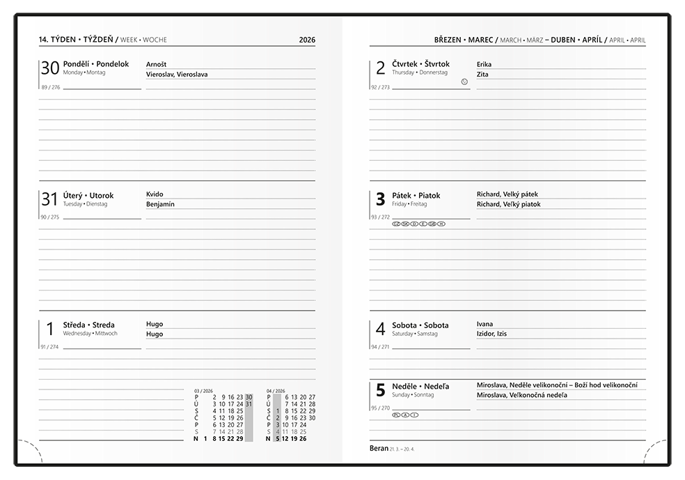 Týdenní diář formátu B6 je vyrobený z matného hladkého lamina s parciálním lakem, který dodává každému diáři šmrnc. Jedná se nejen o skvělý doplněk, ale také si budete moci efektivněji plánovat Váš čas. Navíc se tento oblíbený formát pohodlně vejde do každé tašky či kabelky.