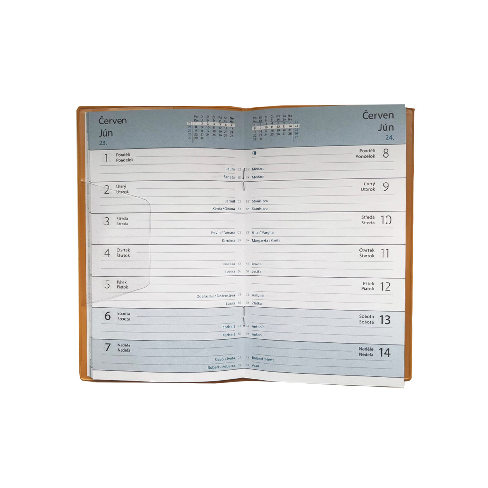 Praktický týdenní diář v odolném PVC obalu, vhodný do tašky či kabelky.