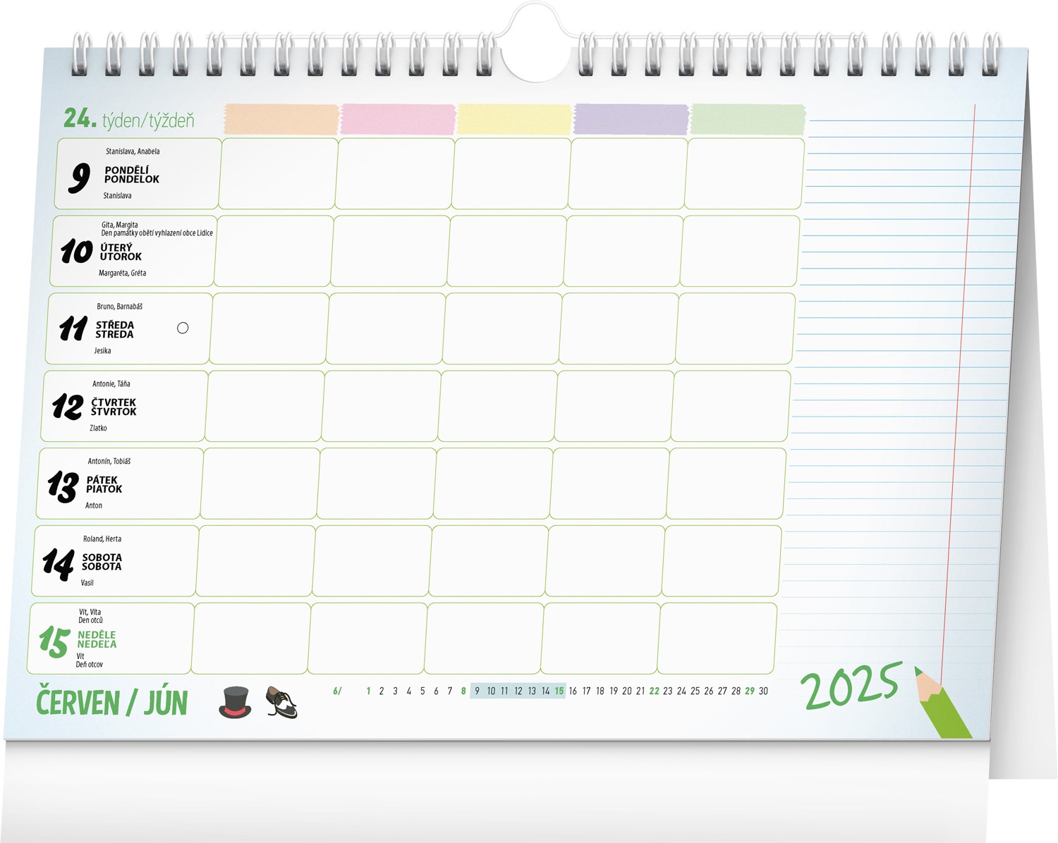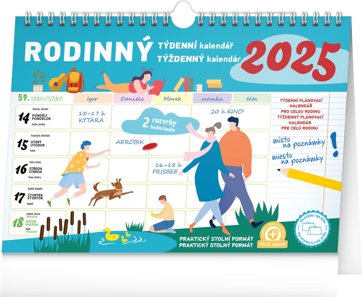 Pro zvládnutí rodinného chaosu je tady týdenní rodinný kalendář, ve kterém si čas naplánuje až pětičlenná rodina. Kalendář můžete použít jako stolní nebo ho pomocí háčku zavěsit na zeď. Obsahuje české a slovenské kalendárium.