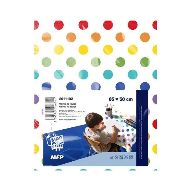Omyvatelný ubrus na lavici s barevným puntíkovým vzorem, který zachytí nečistoty při práci s barvami, lepidlem nebo fixy. Pomáhá udržet stůl čistý při výtvarné výchově i domácím tvoření.