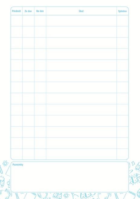 Pomáhá mít všechny školní úkoly a poznámky pohromadě, bez zbytečného hledání v sešitech nebo papírech. Stačí ho otevřít a hned je jasné, co je potřeba si zapsat nebo připomenout. Formát A5 dává dostatek prostoru pro běžné školní zápisy. Větší rozměr ocení děti i při delších poznámkách nebo zadáních, která je potřeba zapsat celé.Úkolníček obsahuje: