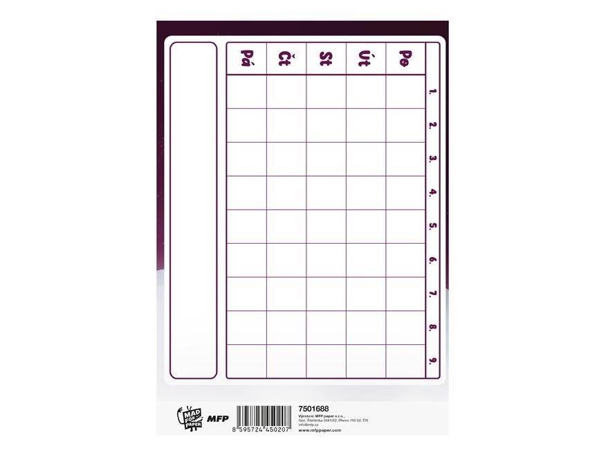 Pomáhá mít všechny školní úkoly a poznámky pohromadě, bez zbytečného hledání v sešitech nebo papírech. Stačí ho otevřít a hned je jasné, co je potřeba si zapsat nebo připomenout. Formát A5 dává dostatek prostoru pro běžné škol