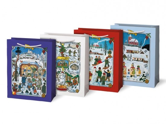 Papírová dárková taška s vánočními motivy Josefa Lady. Taška má pevné ucho pro snadné přenášení a štítek pro vepsání jména či přání.