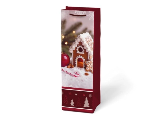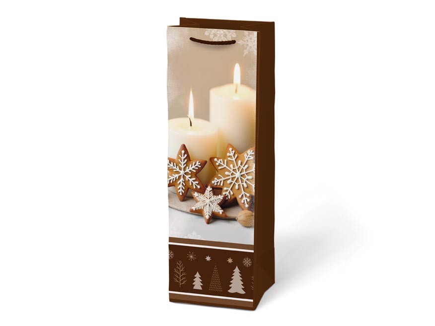 Darovat lahev vína, sektu nebo domácího punče nebylo nikdy snazší. Papírová dárková vánoční taška MFP T12 má úzký a vysoký tvar, který je přímo stvořený pro balení lahví. Stačí vložit, předat – a o sváteční atmosféru se postará krásný vánoční motiv.