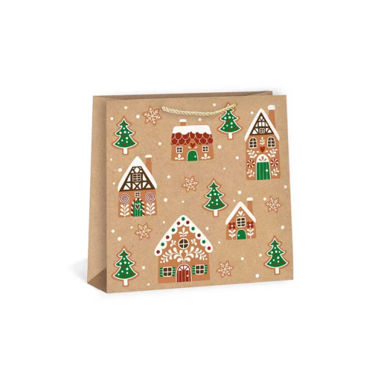 Vánoční přírodní dárková taška ve tvaru čtverce s jednoduchým, výrazným potiskem. Vyrobená z kvalitního pevného přírodního papíru pro rychlé a praktické zabalení dárků všech velikostí. Kvalita zpracování zaručuje dostatečnou pevnost proti protržení dna nebo odtržení oušek.