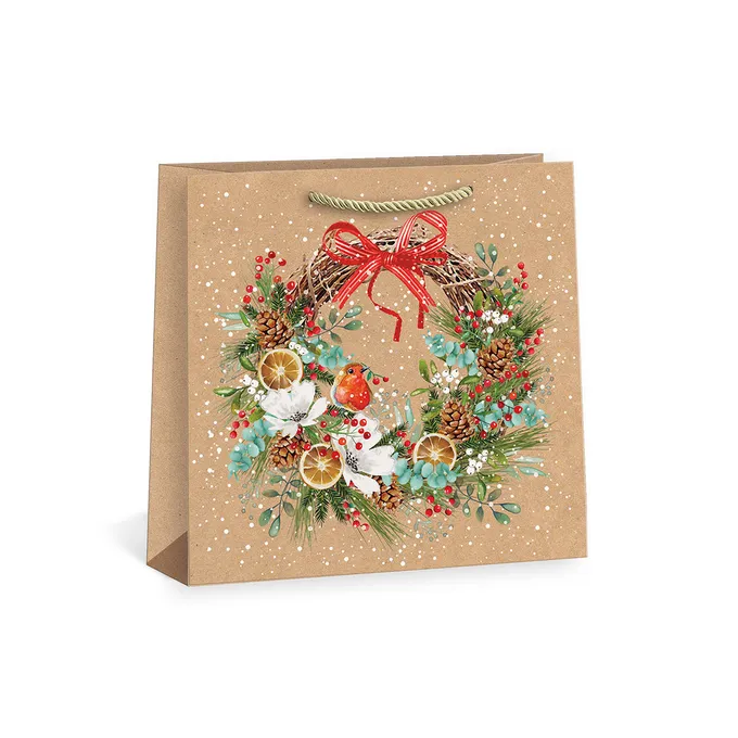 Vánoční přírodní dárková taška ve tvaru čtverce s jednoduchým, výrazným potiskem.