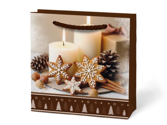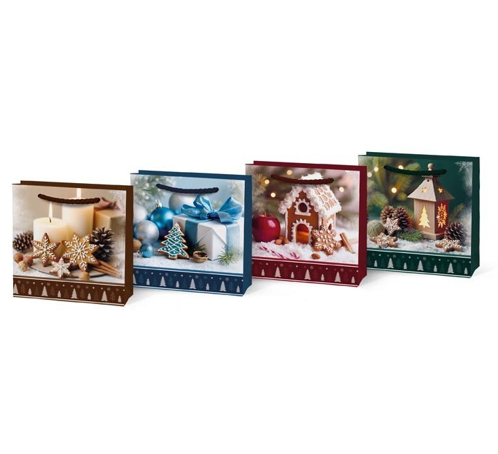 Dárková papírová taška T0 s bohatým vánočním motivem – ideální na drobné dárky, přání nebo malou pozornost. Realistické fotografie se svíčkami, perníčky, dárky nebo zimními dekoracemi vytvářejí teplou a slavnostní atmosféru.