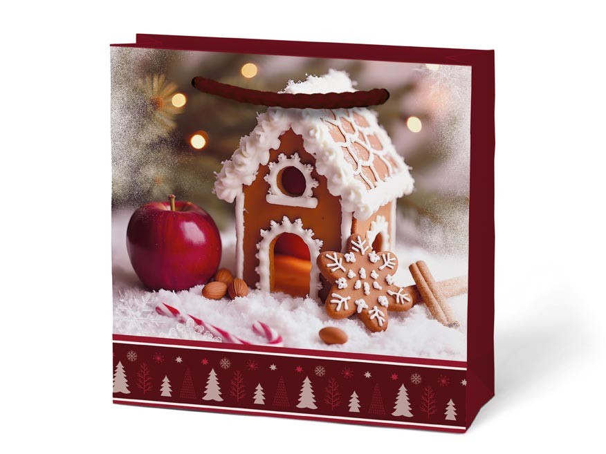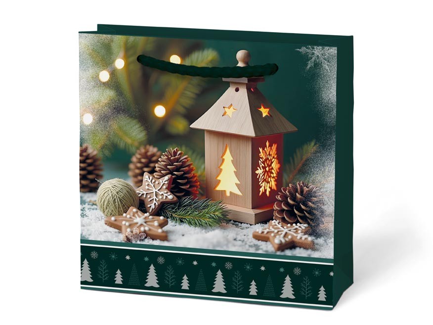 Malý formát tašky působí mile a osobně. Je opatřena pevnými šňůrkovými uchy a spodním dekorem s vánočním motivem, který celé balení krásně doladí. Skvělá volba pro drobnosti, které potěší nejen obsahem, ale i balením.