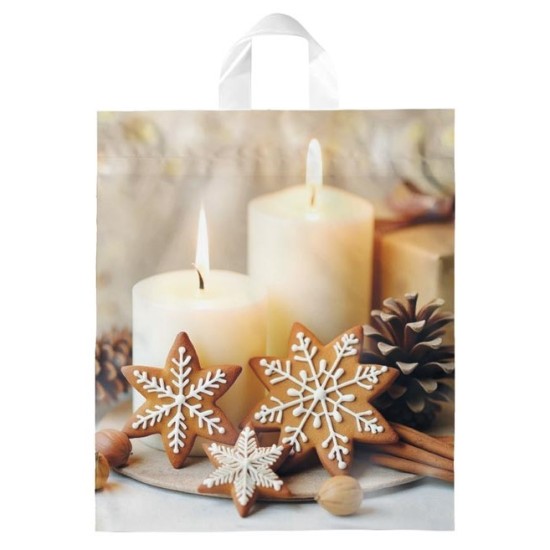 Elegantní igelitová nákupní taška s vánočním motivem svíček, perníčků a přírodních dekorací navodí hřejivou, sváteční atmosféru. Jemný a decentní design v přírodních tónech působí vkusně a klidně – ideální na adventní nákupy. Díky rozměrům a pevnému materiálu s praktickými uchy je taška nejen krásná, ale i odolná a prostorná.
