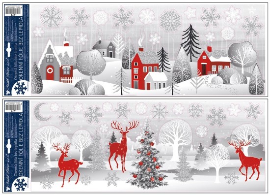 Silulety domků a zasněžených stromů a jelínků v krajině vytvářejí zimní pohodu. Tato fólie se hodí pro použití doma, v kancelářích, kavárnách i výlohách a dotvoří příjemnou sváteční scenérii.