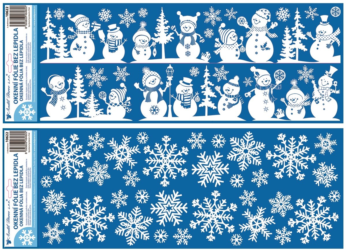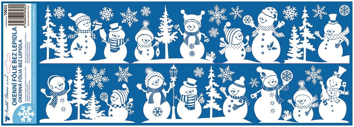 Okenní fólie s motivem sněhuláků a sněhových vloček doplněná třpytivým efektem o rozměru 60 × 22,5 cm krásně rozzáří vaše okna během zimního období. Přilne elektrostaticky – bez lepidla, nezanechává žádné stopy, snadno se ap