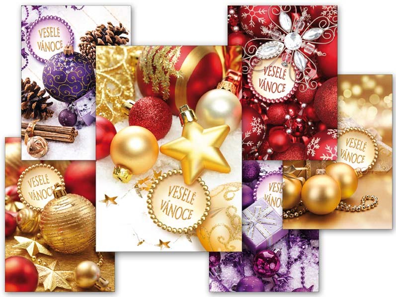 Pohlednice s obrázky vánočních ozdob. Text obsahují 3 pohlednice z 6. Dodáváme v mixu dle skladové zásoby.
