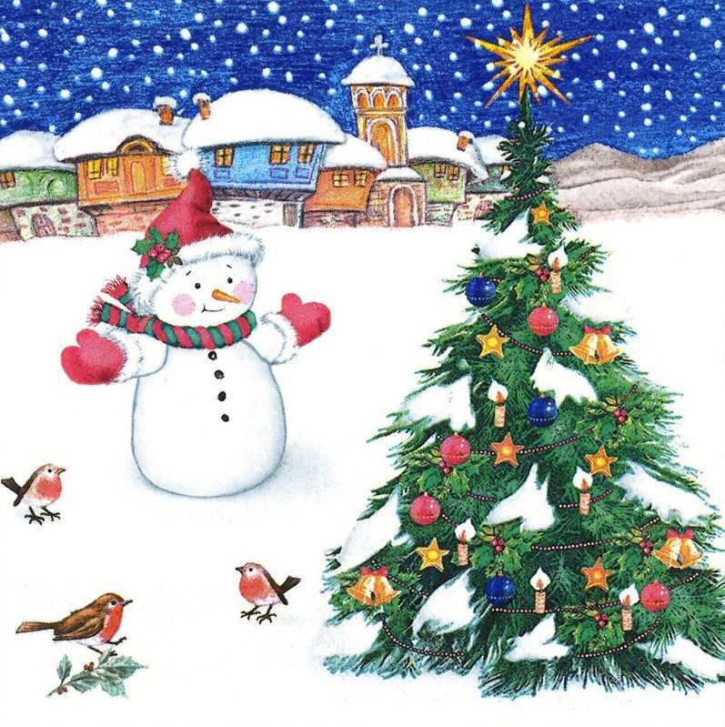 Papírové vánoční ubrousky s motivem sněhuláka u vánočního stromku.
