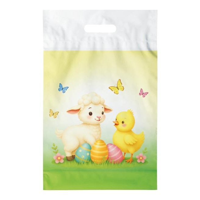 Velikonoční igelitová taška MFP ve větší velikosti nabízí dostatek prostoru pro bohatší výslužku.Taška je opatřena výřezovým průhmatem, takže se pohodlně nosí i při plném naplnění.