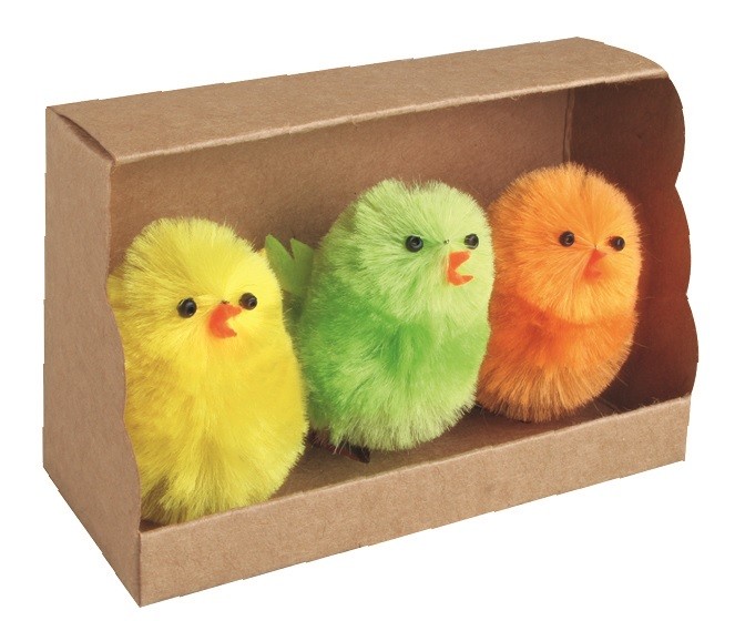 Barevná velikonoční kuřátka v kraftové krabičce.