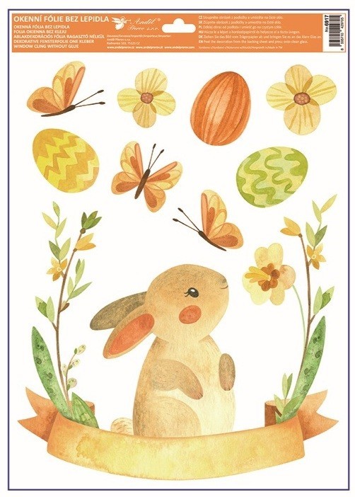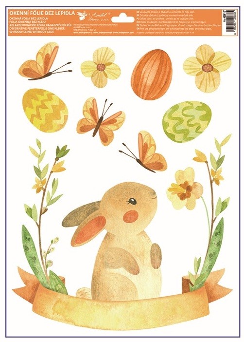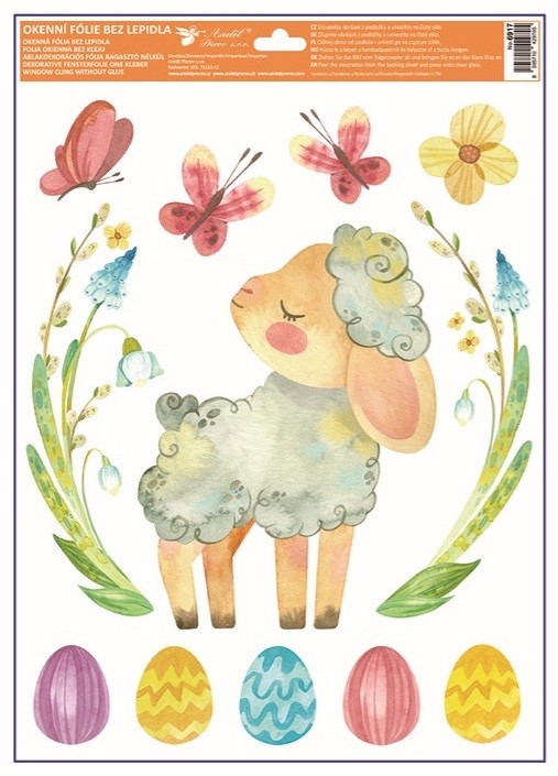 Tato dekorační okenní fólie s něžným velikonočním motivem zvířátek, květin a kraslic o rozměru 30 × 42 cm vnese do interiéru jarní pohodu a sváteční náladu. Přilne elektrostaticky – bez lepidla, nezanechává žádné stopy, snadno se aplikuje a je opakovaně použitelná.