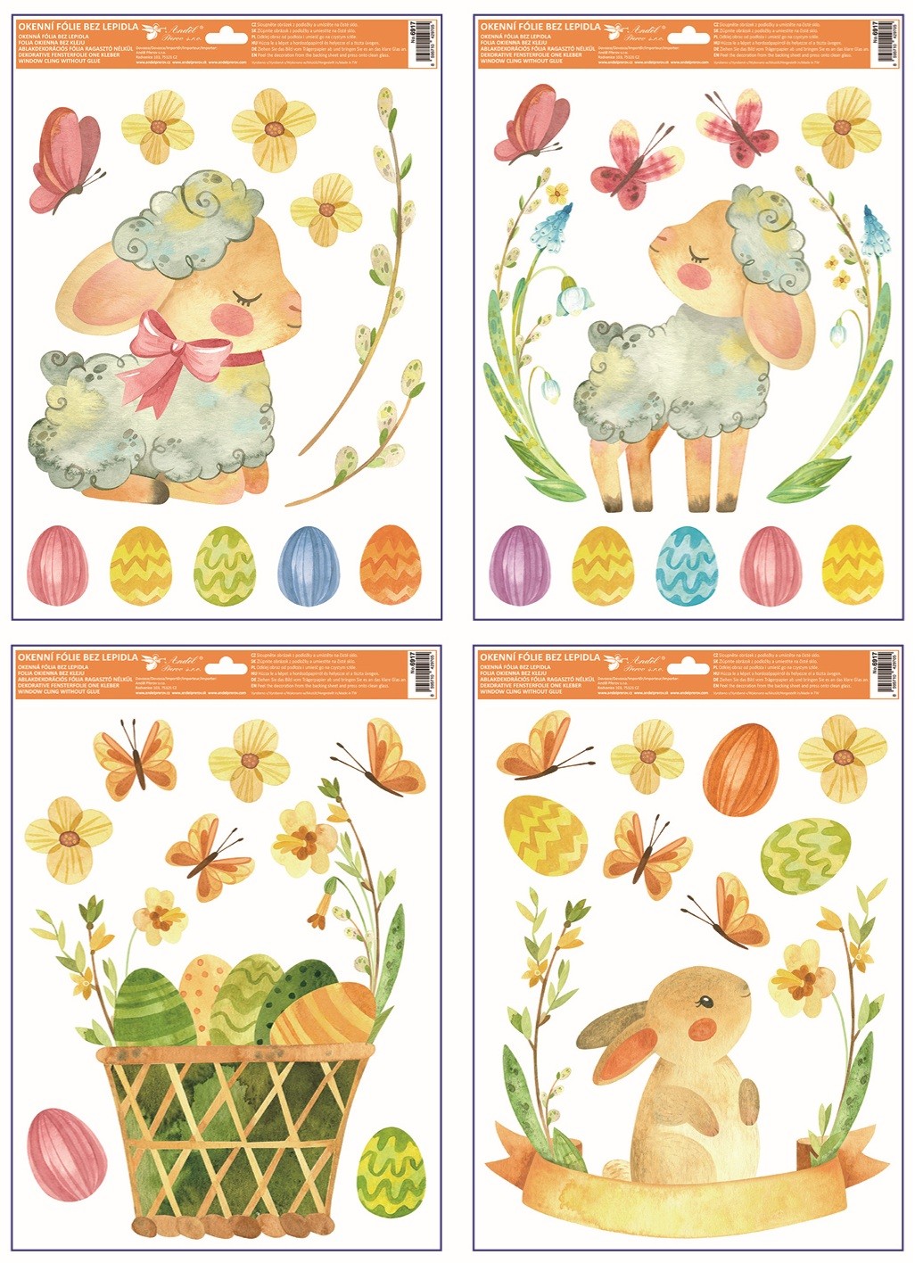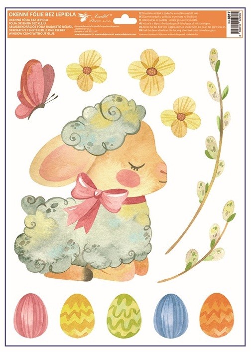 Velikonoční motiv s jemnými ilustracemi zvířátek, květin a barevných vajíček působí lehce a harmonicky a krásně vynikne na oknech, vitrínách i zrcadlech. Třpytivé detaily glitrů dodají dekoraci jemný lesk, který na světle přirozeně vynikne.