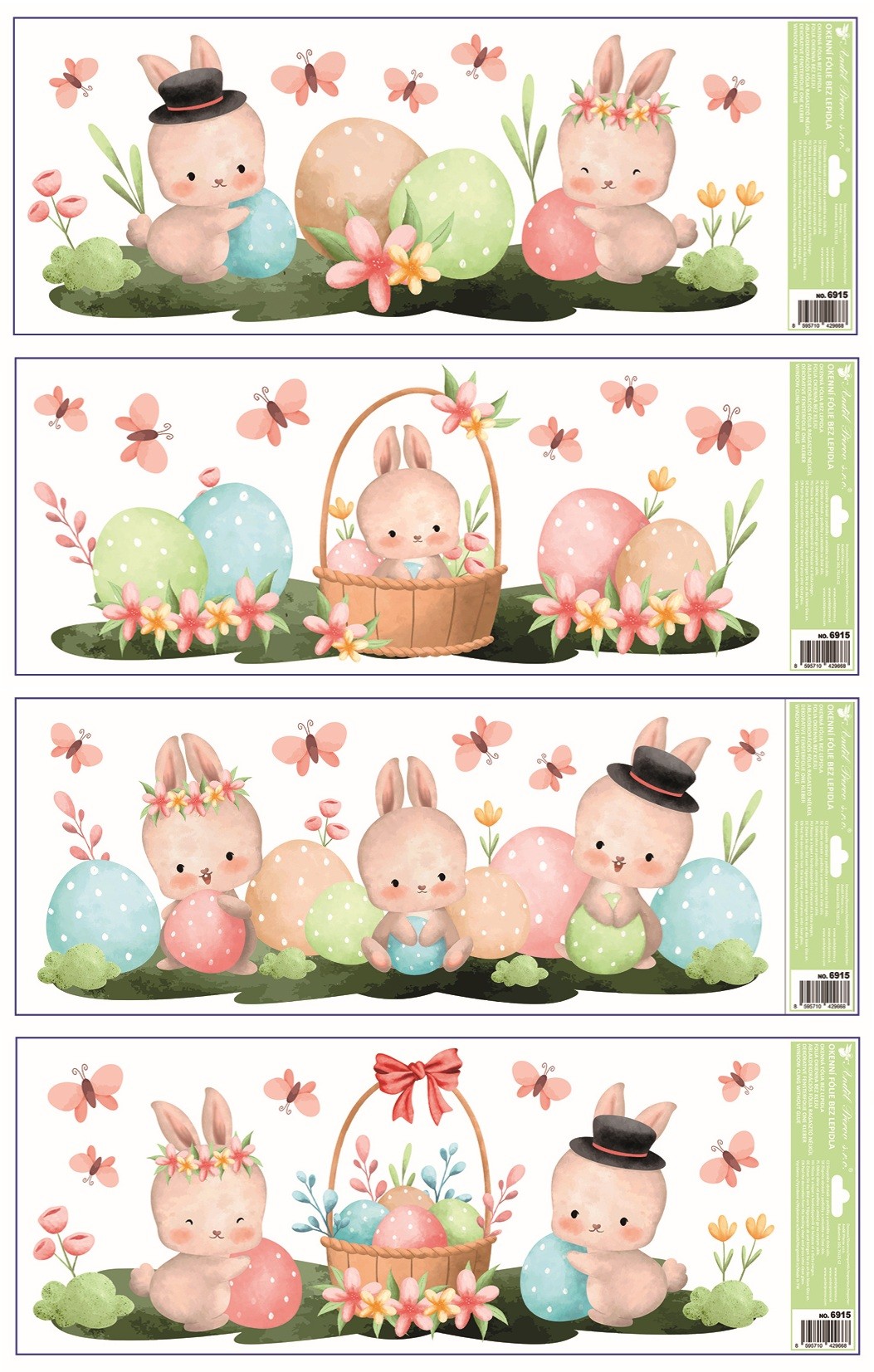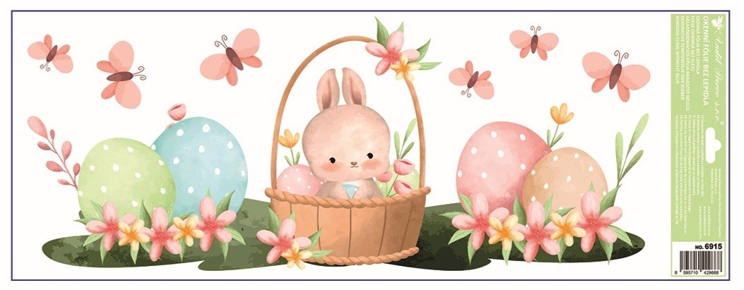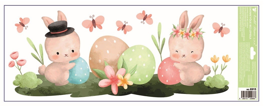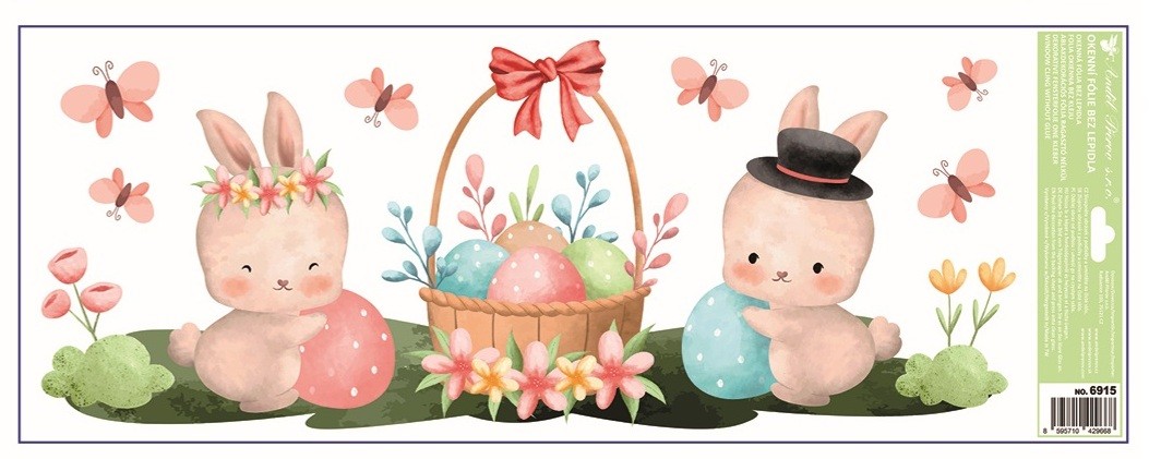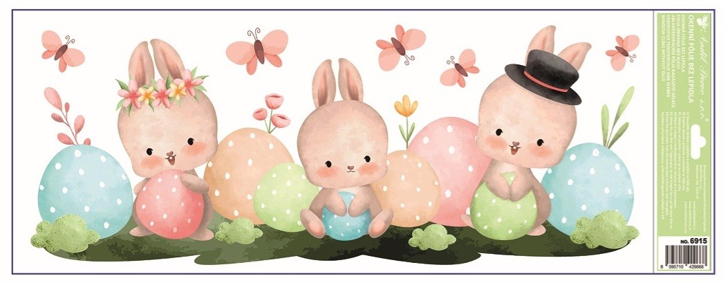 Dekorační okenní fólie ve formě pruhu s roztomilým velikonočním motivem zajíčků a kraslic o rozměru 22,5 × 60 cm je ideální pro ozdobení spodní nebo horní části okna. Přilne elektrostaticky – bez lepidla, nezanechává žádné sto