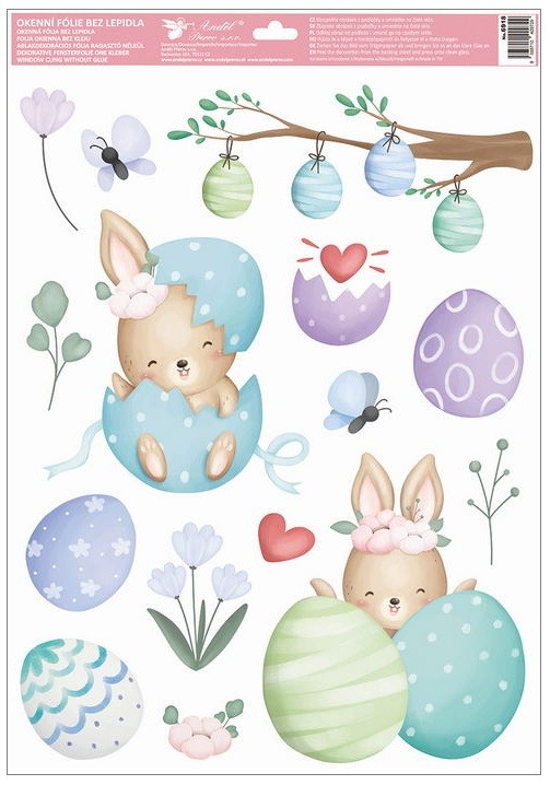 Tato dekorační okenní fólie s roztomilým velikonočním motivem zajíčků, kraslic a jarních detailů o rozměru 35 × 50 cm vnese do interiéru svěží a sváteční atmosféru. Přilne elektrostaticky – bez lepidla, nezanechává žádné stopy, snadn