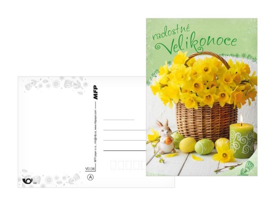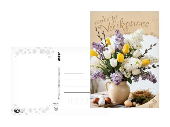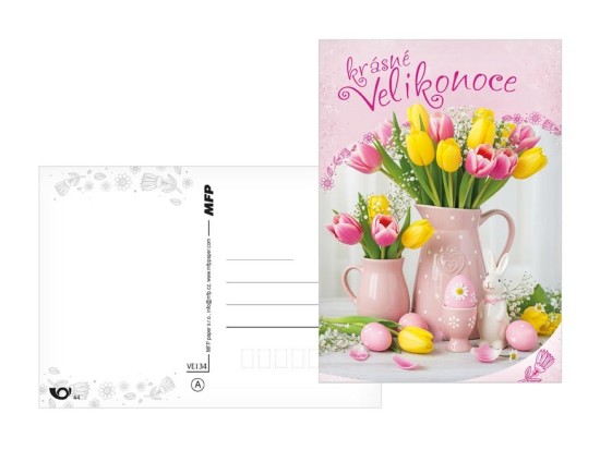 Velikonoční pohlednice je jednoduchý způsob, jak někomu udělat radost. Na zadní stranu můžete napsat vlastní přání — všechny motivy jsou bez textu, takže máte volný prostor pro osobní vzkaz.Text na přední straně: