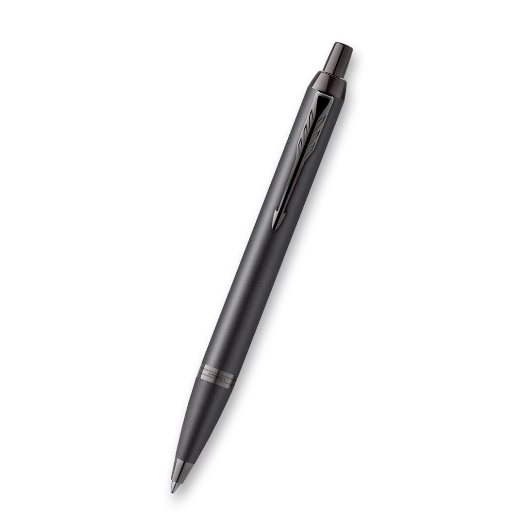 Dárková krabička s kuličkovým perem Parker IM Monochrome Titanium s mosazným tělem pokrytým matným tmavým lakem. V kombinaci s příslušenstvím potaženým technikou PVD s odolnou lesklou tmavou barvou.